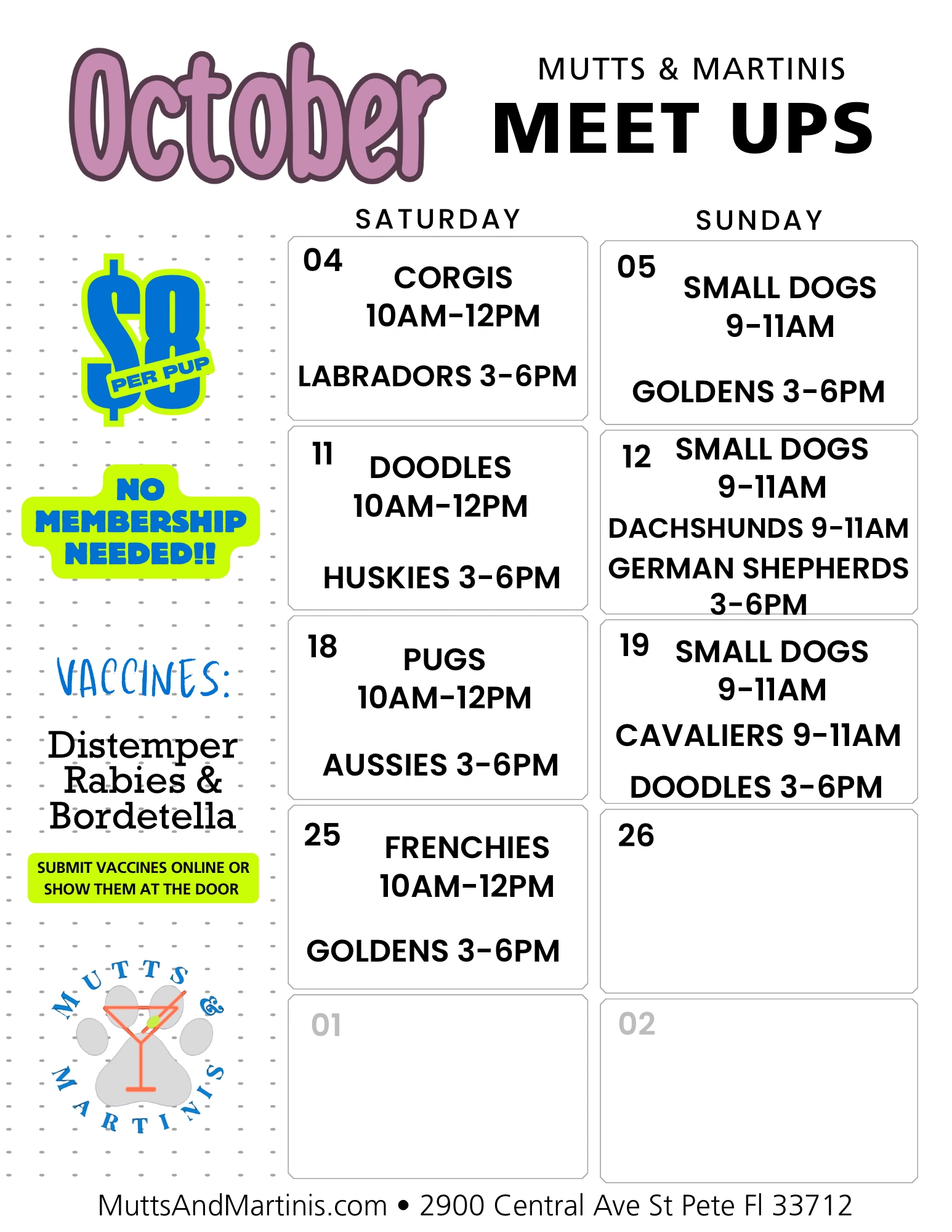 Any questions dm us! We welcome any size any breed anytime. No memberships needed! $8 per pup with proof of vaccines: Rabies, Distemper & Bordetella. Submit vaccines online at MuttsAndMartinis.com or show them at the door. Digital or paper copy is acceptable.